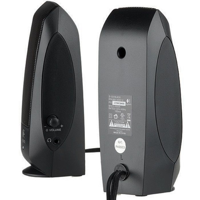 980-000010Altavoces Logitech S-120Para equipos de sobremesa y portátiles en casa, 2.3 vatios de potencia, color negroCaracteristicas:*Tipo de altavoces: Activa *Potencia nominal de salida (Total): 2.3 vatios *Respuesta de frecuencia: 50 - 20000 Hz *Amplificador de sonido: Integrado *Controles: Encendido/apagado, volumen *Altavoces incluidos: 2 - 1.15 vatios - 50 - 20000 Hz - cableado *Tipo de conector: Entrada de la línea de audio Auriculares ( minijack estéreo 3.5 mm )* Dispositivo de alimentación: Fuente de alimentación - interna. Voltaje necesario: CA 230V(altavoz)