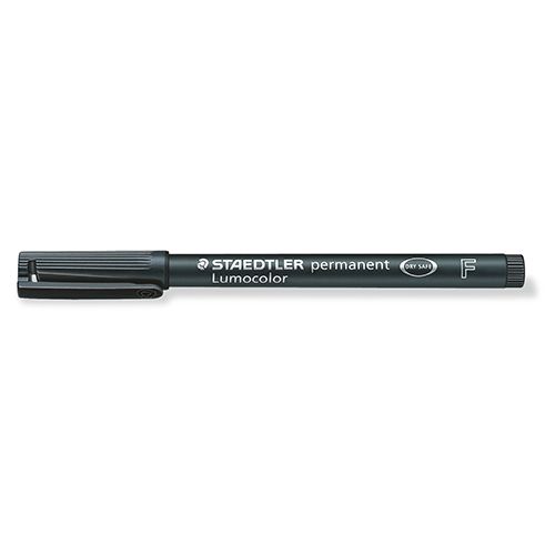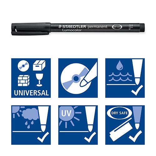 4007817332474DESCRIPCIÓN:*Rotulador universal para casi todas las superficies*Ancho de línea F, aprox. 0.6 mm*Ideal para la oficina*Seca en segundos, ideal para usuarios zurdos*Color negro resistente a la intemperie*Permanente, sin olor. Tinta sin xileno ni tolueno(permanente lumocolor rotuladores)