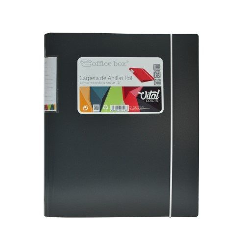 44018· Carpetas de anillas en "D" de 40 mm.· Con cierre de goma redonda ancha en color blanco.· Con compresor de hojas incluido.· Incluye etiqueta personalizable.· Lomo redondo.· Medidas A4: 32,5 x 28 cm· Formato A4+(oficina hogar escolar)