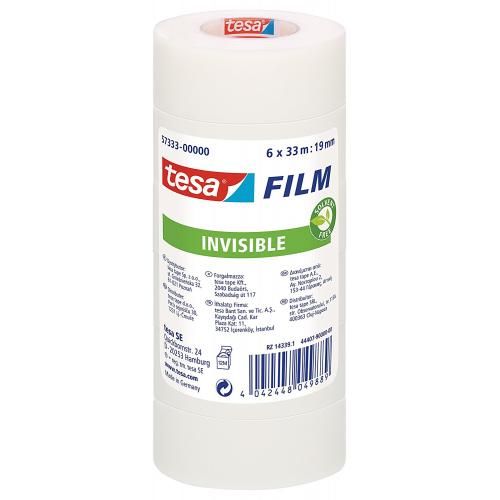 57333Descripción:• Pack de 6 Cintas adhesiva invisible 33x19 sin disolventes, ideal para reparar documentos.• Para usar en la oficina, en casa, ideal para farmacias.• Invisible sobre papel blanco y superficies mates.• Permite escribir sobre ella. Invisible también al fotocopiado.• No amarillea con el tiempo.• Medidas 33 metros de largo x 19mm de ancho(celo adhesivo 19x33 reciclados invisibles)