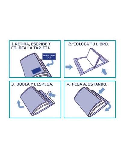 33061 · Pack de 10 und de Forralibros para libros de 30cm alto y largo universal ajustable.· Forro protector para libro ajustable.· Adhesivo removible para fijar sin dañar el libro.· SOLAPA MARCA PÁGINAS con nuevo indicador de uso.· Fuelle especial para un ajuste perfecto.· ETIQUETA PORTA NOMBRES frontal incluida con sistema de seguridad, anti rotura y cambio.· Fabricado en polipropileno.
