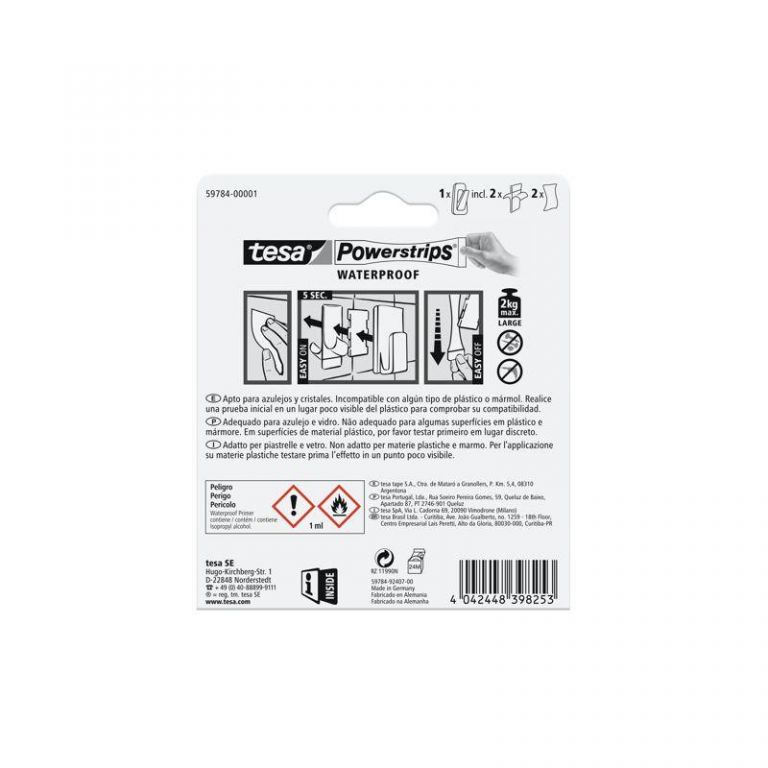 5978401 4042448398253 • Fácil de montar sin taladrar, tornillos o clavos.• Fuerte sujeción de hasta 2 kg.• Se retira sin dejar rastro.• Combinación de materiales: acero inoxidable y plástico.• Ideal para azulejos, vidrio, etc. en habitaciones húmedas (por ejemplo, baños, cocinas, etc.) o directamente en la ducha.• Gancho reutilizable.• No apto para su uso en espuma de poliestireno, material espumado, superficies con revestimiento antiadherente, material poroso.( ferreterías hogar)