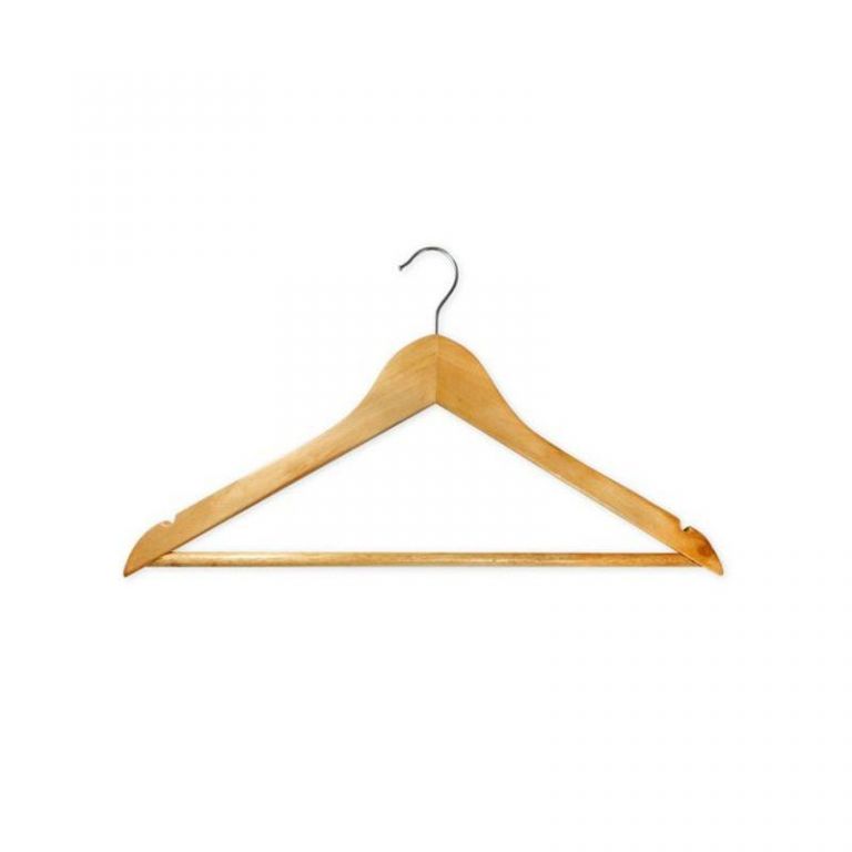 1842217525053 • Set de5 perchas.• Material: madera.• Barra para los pantalones y muescas para evitar que se deslicen las prendas.• Gancho cromado.• Calidad de la madera de grado B/C.• Medidas: ancho 44,5cm.( ferreterias hosteleria hogar)