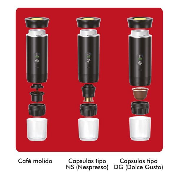 MV0645 8436049041698CAFETERA PORTATIL 3 EN 1 XPRESSCUP BLANCA MUVIP• Disfruta del café perfecto estés donde estés. Esta cafetera portátil 3 en 1 está diseñada para acompañarte en tus aventuras, viajes o simplemente para darte un buen café en la oficina o en casa, sin cables ni complicaciones...• Compatibilidad total:• Compatible con café molido, cápsulas tipo DG (Dolce Gusto) y NS (Nespresso).• Elige tu estilo, sabor y forma favorita de preparar café.• Modo caliente / Modo frío:• Extracción en caliente: lista en 5-6 minutos, con una presión profesional de 20 bares.• Cold brew: perfecto para café frío en días calurosos o para los más modernos.• Potencia y autonomía:• Batería recargable de 7500mAh (3 x 2500mAh) para preparar hasta:* 4-5 cafés con 50 ml de agua* 3-4 cafés con 80 ml de agua* ¡Más de 50 cafés en modo directo sin calefacción!• Puerto de carga USB-C (5V/2A), batería extraíble.• Especificaciones técnicas:• Capacidad del depósito de agua: 80 ml de acero inoxidable con marcas visibles.• Capacidad del vaso: 150 ml• Materiales: ABS + PC + acero inoxidable 304• Potencia: 72W | Voltaje de trabajo: 12V• Funciones inteligentes:• Pantalla digital LED con indicador de temperatura en tiempo real• Alerta de batería baja• Cambio de modo con un solo botón• Soporte plegable de aleación de aluminio• Llévala donde quieras:• Ideal para camping, coche, moto, oficina o senderismo. Compacta, ligera y elegante, esta cafetera es tu nuevo ritual portátil para disfrutar del auténtico sabor del café estés donde estés.Comprar Cafetera Portatil LanzaroteComprar Cafetera Portatil CanariasComprar Muvip CanariasTienda Mandatelo Oficial