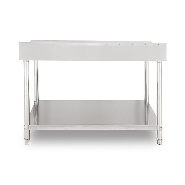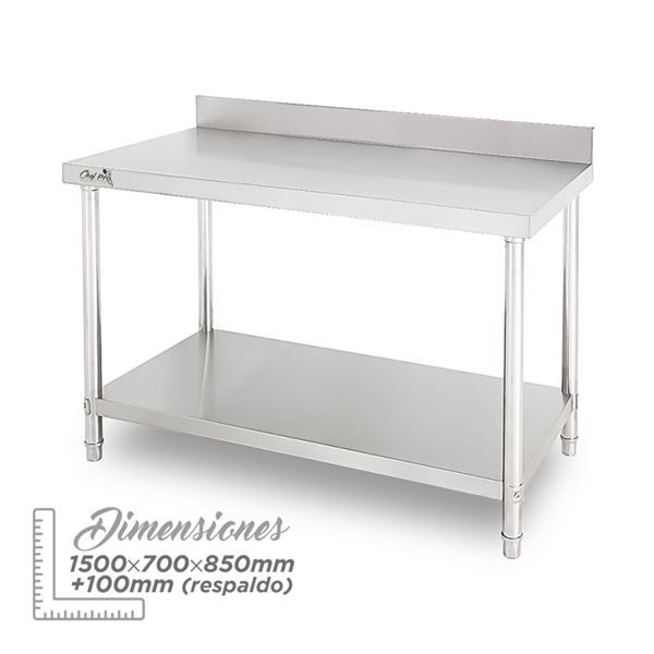 CF0136 8436049043098MESA DE TRABAJO ACERO INOXIDABLE 150X70X85CM CON RESPALDO CHEF PRO• La mesa de trabajo CHEF PRO CF0136 está fabricada en acero inoxidable de alta resistencia (SS201), ideal para cocinas profesionales, restaurantes, hoteles y catering.• Incorpora un respaldo trasero de 10 cm, que evita derrames y mantiene la pared limpia, ofreciendo mayor higiene y comodidad en la preparación de alimentos.• Su estructura reforzada y estante inferior proporcionan gran capacidad de carga y organización.• Tubos redondos de soporte que garantizan estabilidad y durabilidad en usos intensivos.• Dimensiones: 1500 × 700 × 850 + 100 mm (respaldo)• Espesor del tablero superior: 1.0 mm• Espesor del estante inferior: 0.8 mm• Refuerzo interno con nervaduras• No regulable en altura• Material: acero inoxidable SS201• Tamaño del embalaje: 1560 × 755 × 190 mmLa mesa se entrega desmontada, incluye instrucciones básicas para montar. ( hosteleria maquinaria cocina restaurante )Comprar Mesa Acero Inoxidable Profesional LanzaroteComprar Mesa Acero Inoxidable Profesional Canarias Tienda Mandatelo Oficial